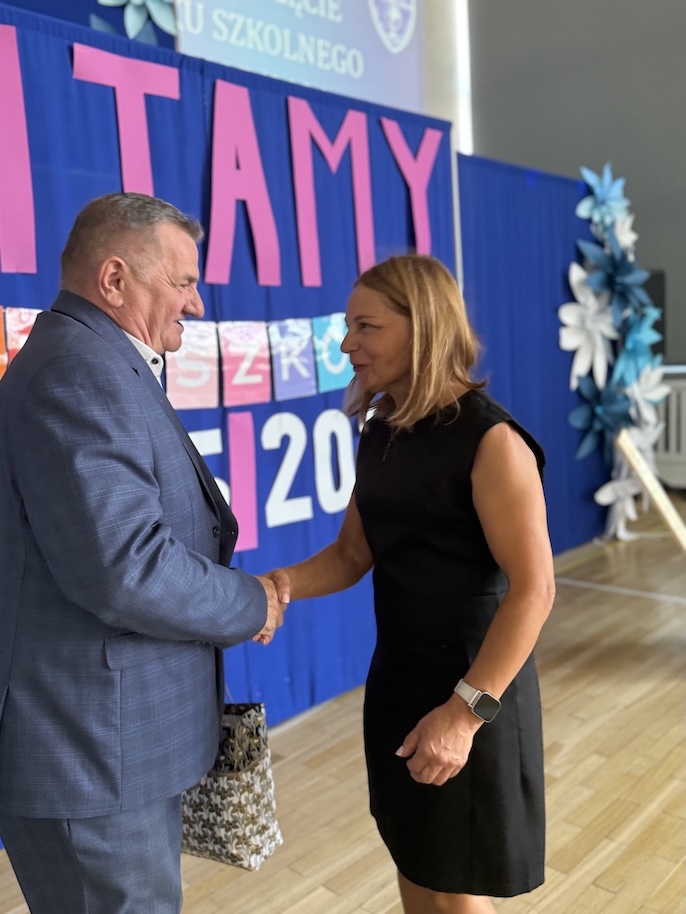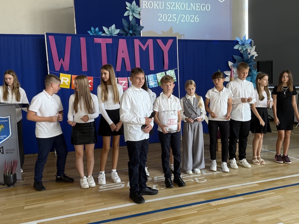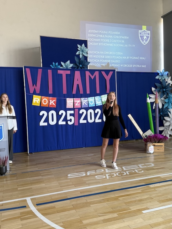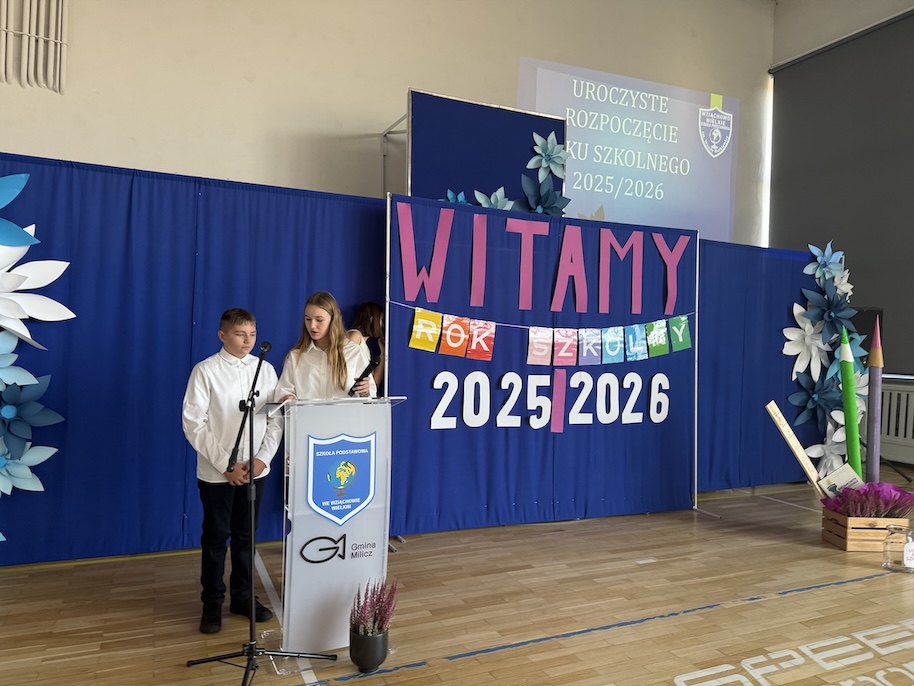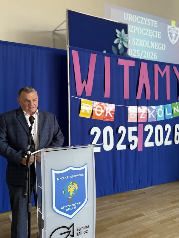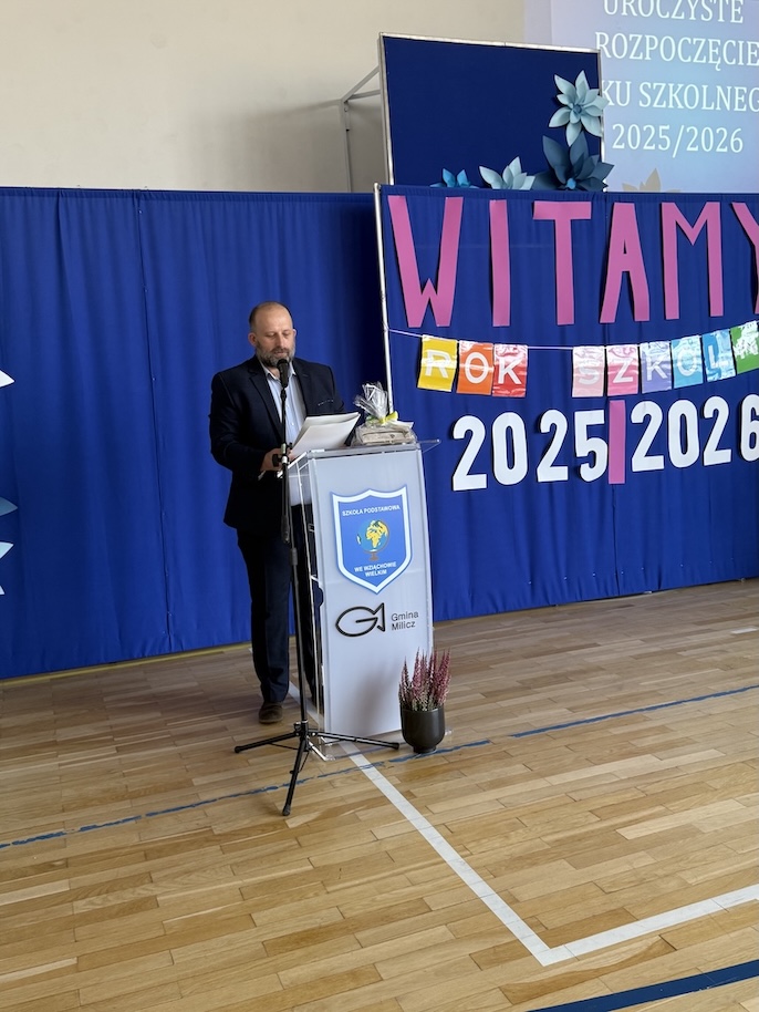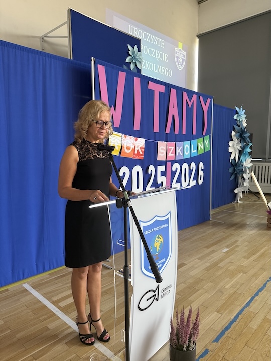 Głos zabrała dyrektor szkoły, p.Małgorzata Posacka, która serdecznie przywitała wszystkich zgromadzonych, a w szczególności nowych nauczyli p. Amandę Olszewską i p. Ewę Lorenz. Oprócz ciepłych słów skierowanych do całej społeczności szkolnej, pani dyrektor przedstawiła priorytety na nadchodzący rok szkolny, czyli zdrowie fizyczne i psychiczne uczniów oraz bezpieczeństwo i tworzenie przyjaznej atmosfery w szkole, która jest dla uczniów drugim domem. Szczególnymi gośćmi na rozpoczęciu roku szkolnego byli przedstawiciele organu prowadzącego, radny Krzysztof Chlistun, który odczytał list i przekazał upominek od pana Burmistrza Gminy Milicz. Ciepłe słowa skierował do uczniów i nauczycieli również radny Andrzej Leszczyszyn, który tradycyjnie podarował słodkie upominki pierwszoklasistom.