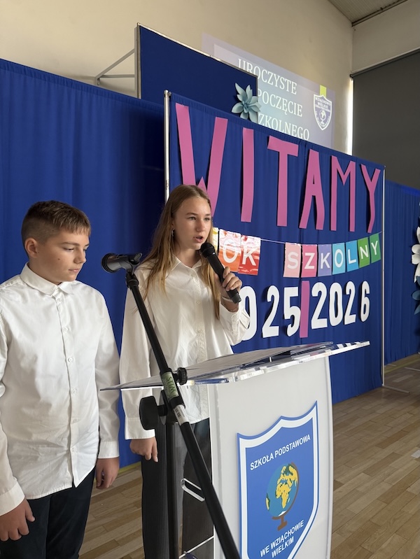 Wszystkich zebranych w sali gimnastycznej: rodziców, nauczycieli, uczniów i pracowników szkoły powitali uczniowie kl.VII, Mikołaj Muszalski i Weronika Peć.