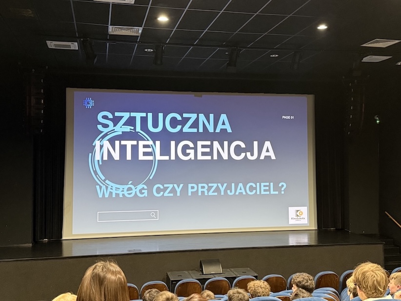 Przed projekcją odbyła się interesująca prelekcja, podczas której uczniowie mogli zastanowić się nad rolą sztucznej inteligencji (AI) we współczesnym świecie. Prowadzący zwrócił uwagę na liczne korzyści płynące z rozwoju nowych technologii – pomoc w nauce, wsparcie w medycynie, rozwój nauki oraz poprawę bezpieczeństwa. Jednocześnie podkreślono, że AI niesie także pewne zagrożenia, takie jak możliwość manipulacji informacjami czy ryzyko utraty samodzielnego myślenia.